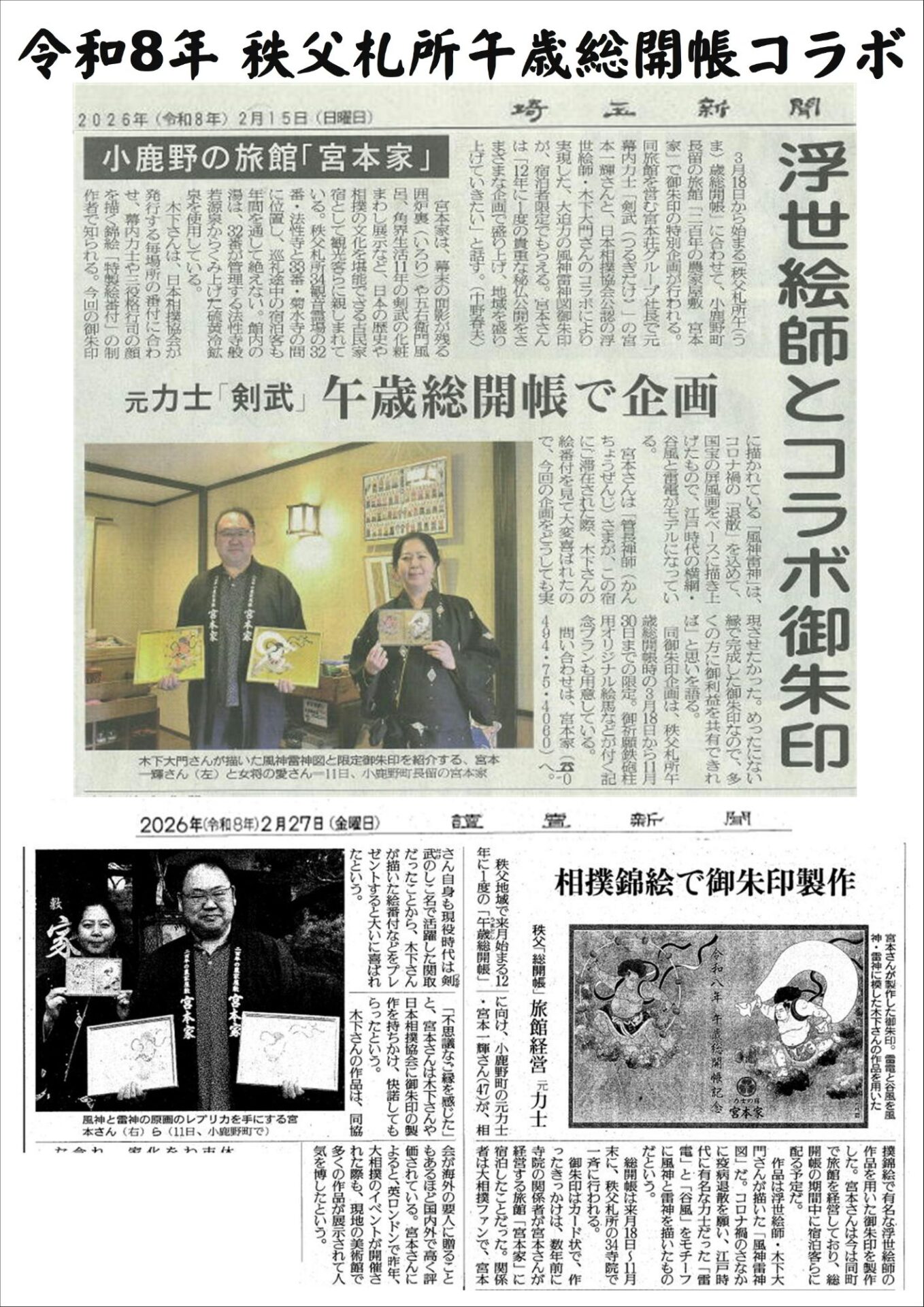 当宿では力士の宿宮本家限定で(公財)日本相撲協会公認の浮世絵師木下大門氏とのコラボ作品で谷風の風神、雷電の雷神図御朱印の配布が実現しました!!